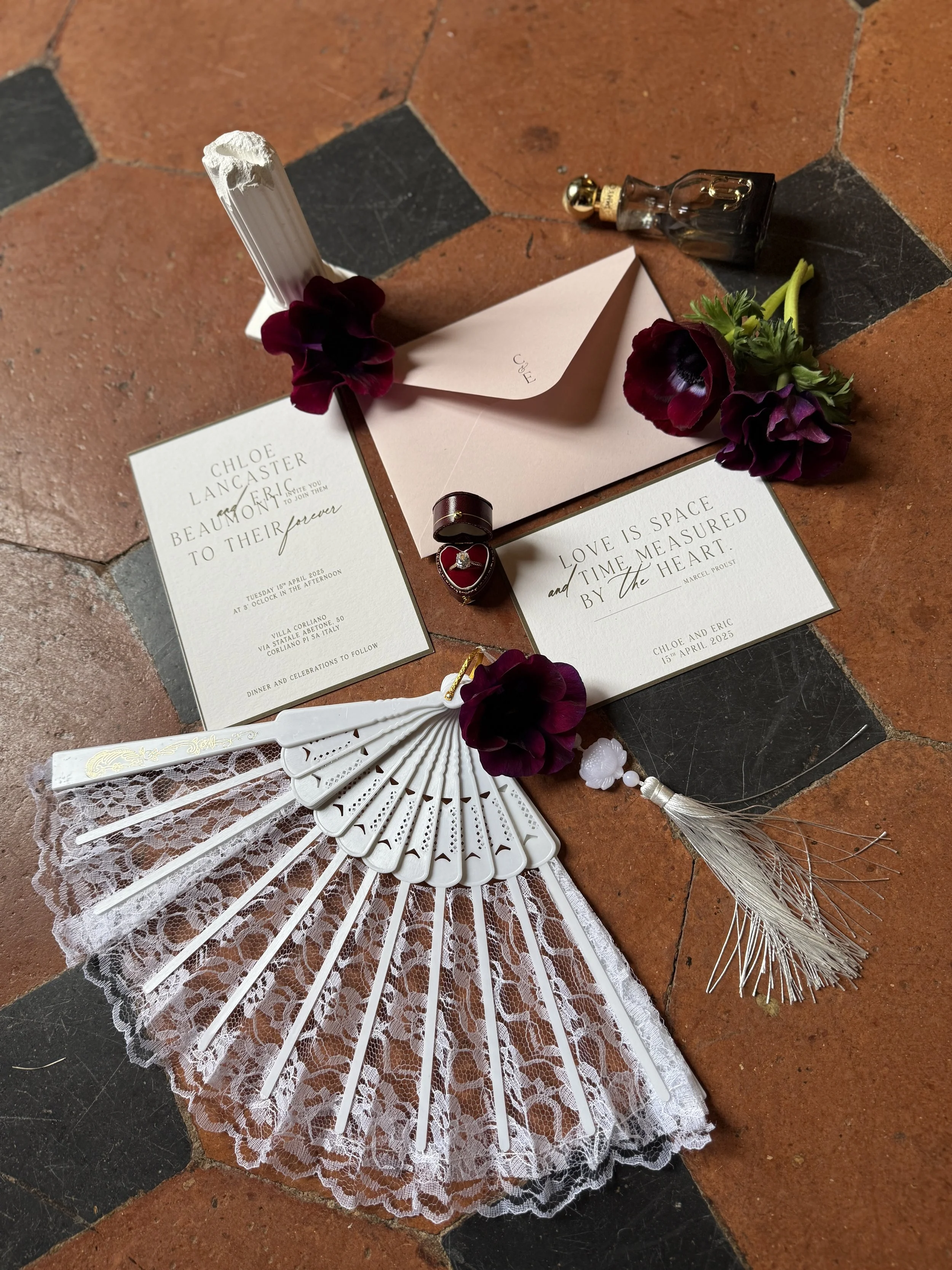 Invito di matrimonio, fiori, anello di fidanzamento, piume e altri accessori romantici disposti su un pavimento di piastrelle rosse e nere.Etike Event Flower Design