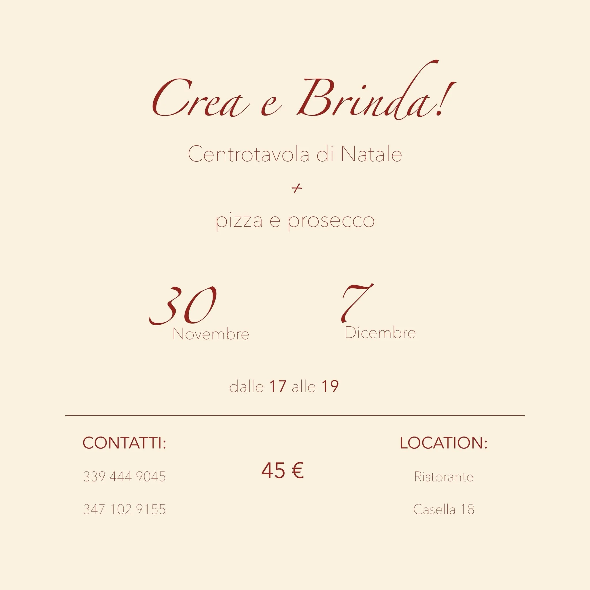Un pomeriggio dedicato alla creatività e alla convivialità, per realizzare insieme il tuo centrotavola di Natale tra profumi di abete, nastri di velluto e candele accese. Un momento per fermarsi, brindare e riscoprire il piacere delle cose fatte a mano, tra sorrisi, ispirazione e l’atmosfera calda delle feste. Guidate da Spirito Libero Flowers, creeremo un pezzo unico da portare a casa… e poi, come ogni festa che si rispetti, ci aspetta pizza e prosecco!