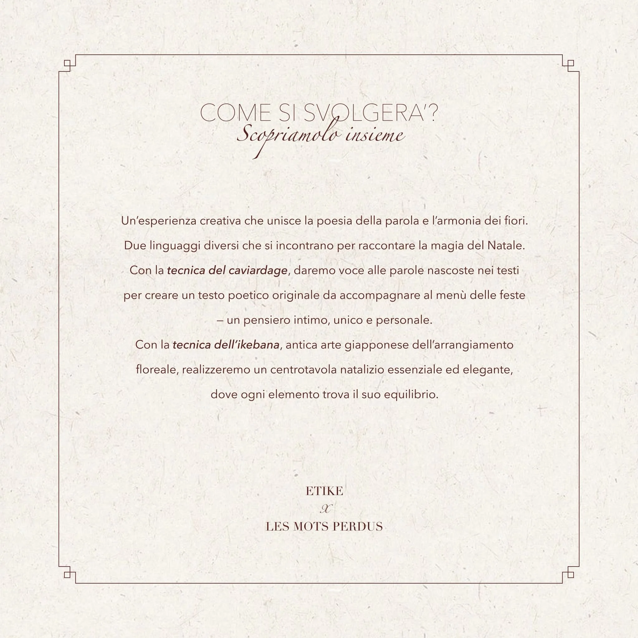 Il workshop, organizzato da Etike, unisce la poesia del caviardage e l’armonia dell’ikebana giapponese per creare un momento unico di espressione personale.